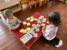 すごろく遊びから、次はカルタ遊びに興味を持ち始めた子ども達です。「これ一緒にしよう」「私がはやかった!(はやくとれた)」と、声を上げながら遊んでいますよ。一枚とれる度に嬉しそうにする子ども達かとっても可愛いですよ(sabo)