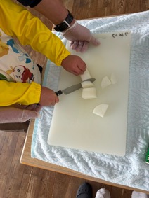 今日は待ちに待ったカレーパーティーの日!つばめ組では「あと何回寝たらカレーパーティー??」というくらいとってもこの日を楽しみにしていました。つばめ組さんは年長なのでじゃがいもを包丁で切るお手伝いもしてもらいます!以前大根も切ったことがあるので慣れた手つきで切っていくつばめ組さん。上手に切ることができました!そのあとは野菜を入れたりお水やルーを入れてもらうお手伝いまでしてくれました。そうしてようやく完成したつばめ組オリジナルカレー。このカレーには豚肉、ニンジンなどのお野菜のほかに、コーンやすりおろしりんご、ニンニクが入っており、トッピングにはチーズとポークピッツもついています!つばめ組だけのオリジナルカレーはとーっても美味しかったようで、おかわり続出でした♡みんながたくさん食べてくれてとても嬉しかったです🎵お手伝いしてくださったお母様方もありがとうございました!!(niiku)