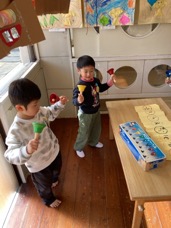 みんな興味津々で音を鳴らすことを楽しんでいます🎵「順番に鳴らしてみよー!」、「かえるの歌やってみたい!」などと友だちと試行錯誤しながら頑張っています。